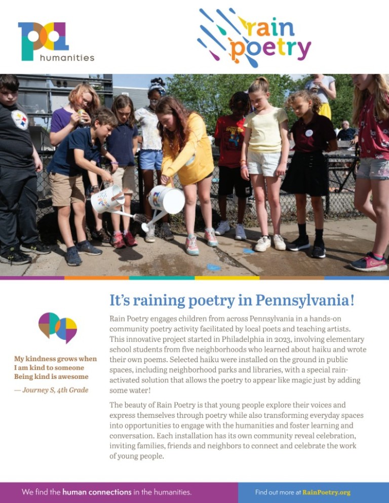 New Rain Poetry Grant & Webinar — PA Humanities is offering grants to help communities create Rain Poetry projects that inspire creativity and local pride, with an informational webinar on November 6 at 12:00 p.m. to share details and guidance for applicants before the December 4, 2025 deadline. Learn more >